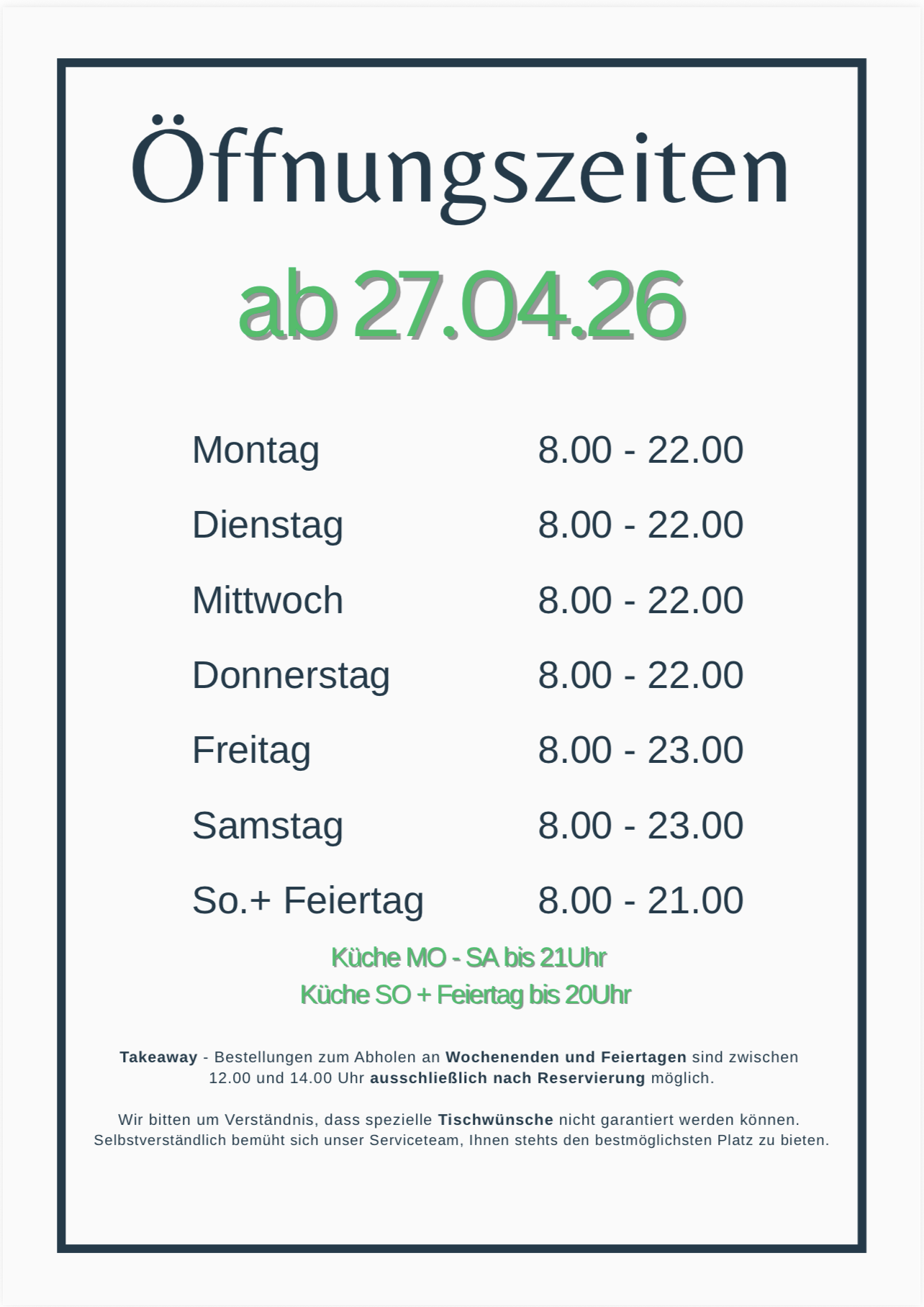 Dienstag bis Samstag von 08:00 bis 22:00 (Küche bis 21:00)